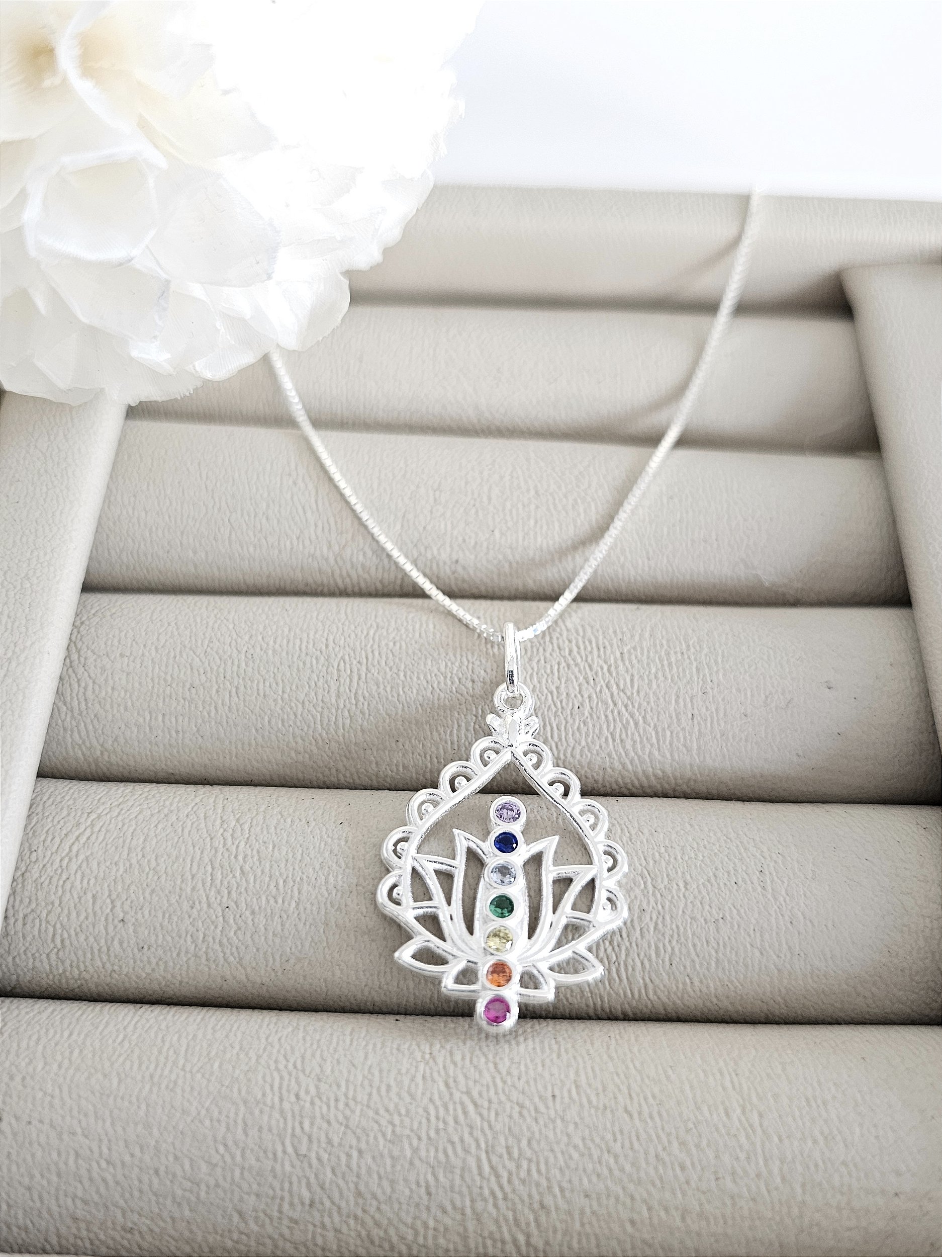 - pingente flor de lótus com microzircônias coloridas de 3 cm.