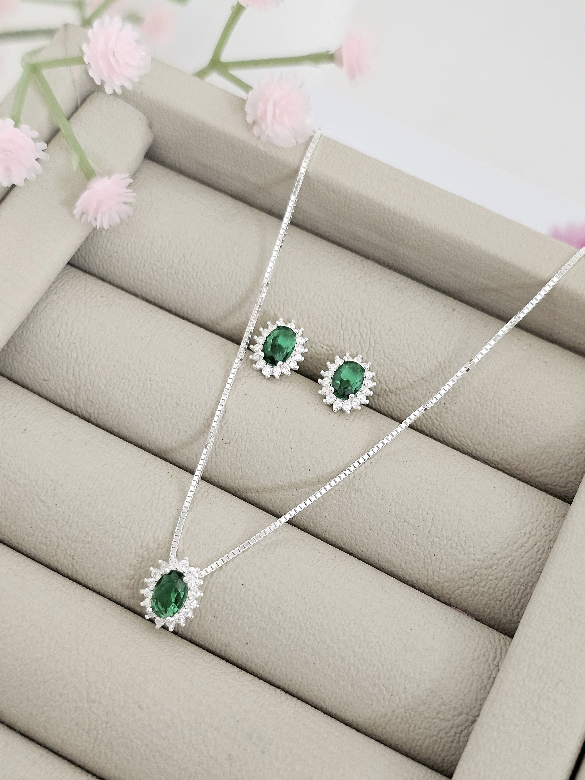 Conjunto ponto de luz oval cravejado prata 925/ cor esmeralda